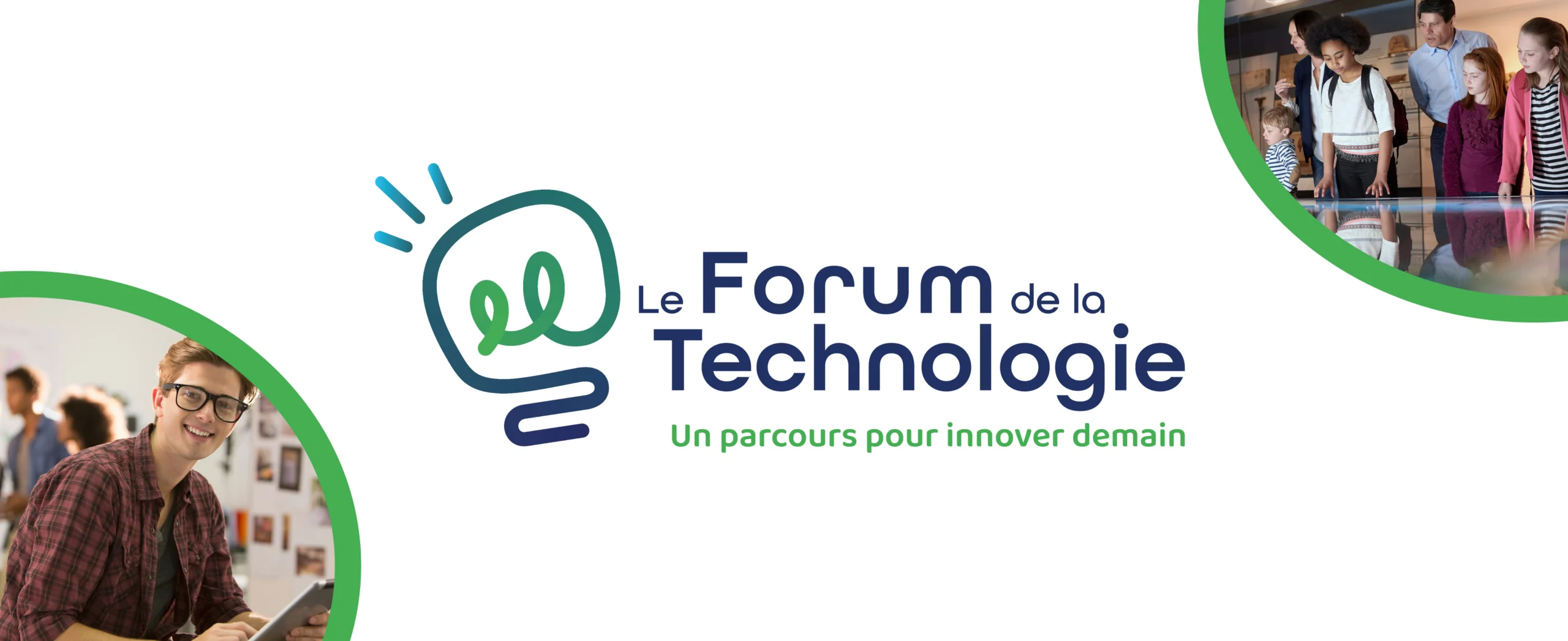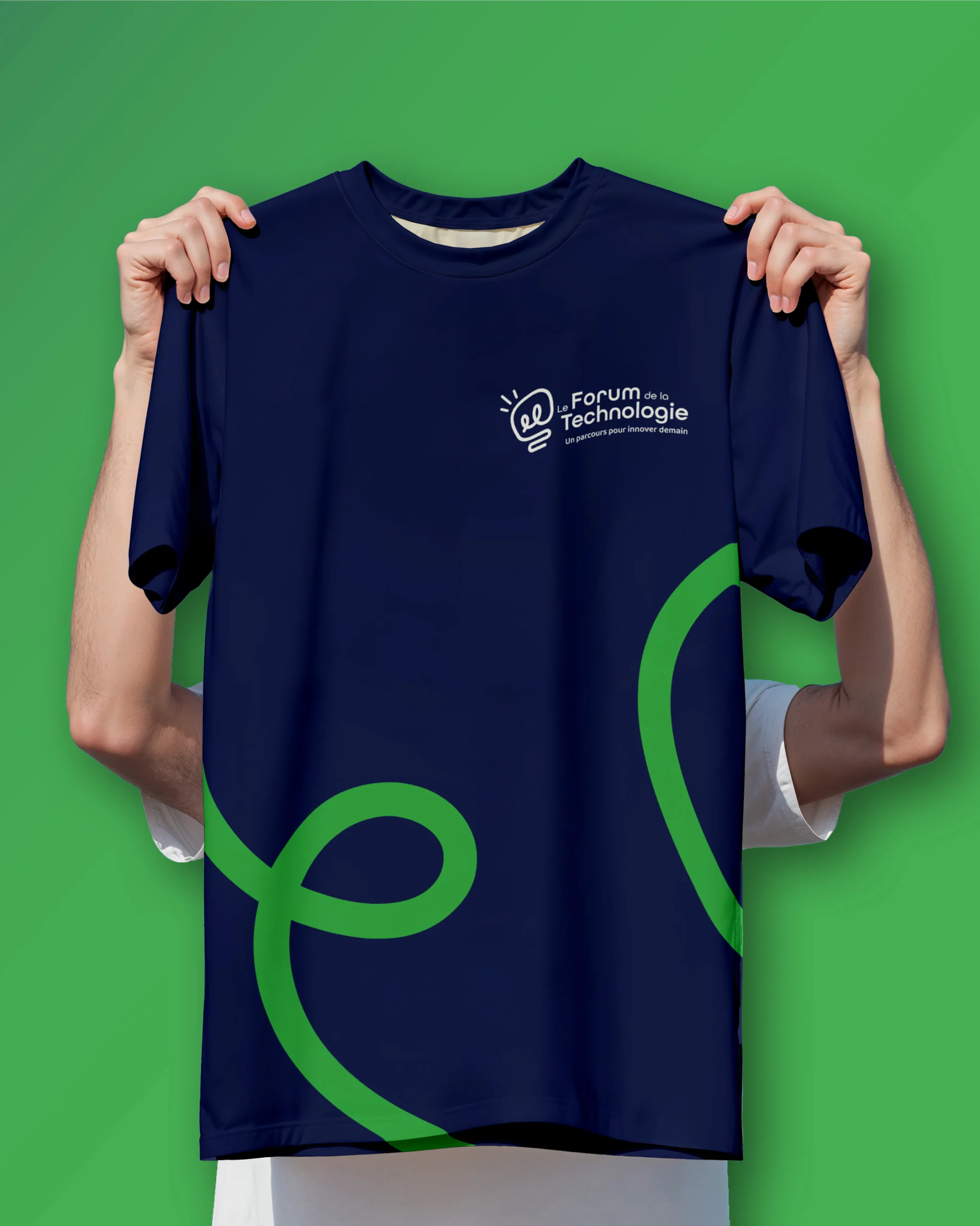 Nous avons conçu le logo et la charte graphique du Forum de la Technologie autour d’un équilibre entre innovation et humanité. Le logotype, structuré autour d’une ligne continue se transformant en ampoule, symbolise à la fois le cheminement des visiteurs pendant la visite et l’émergence des idées. Le choix des couleurs, associant le bleu et le vert, évoque la rigueur scientifique, la confiance et l’innovation durable.
